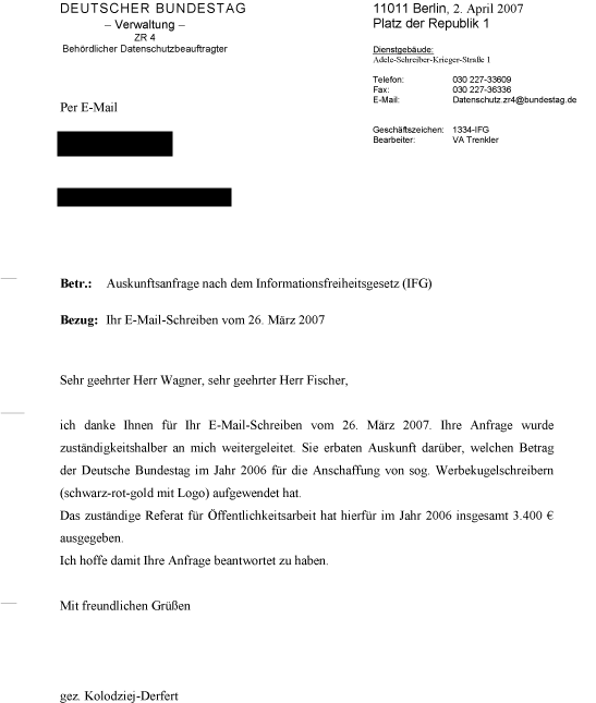 Auskunft des Deutschen Bundestags über Ausgaben für Werbekugelschreiber im Jahr 2006